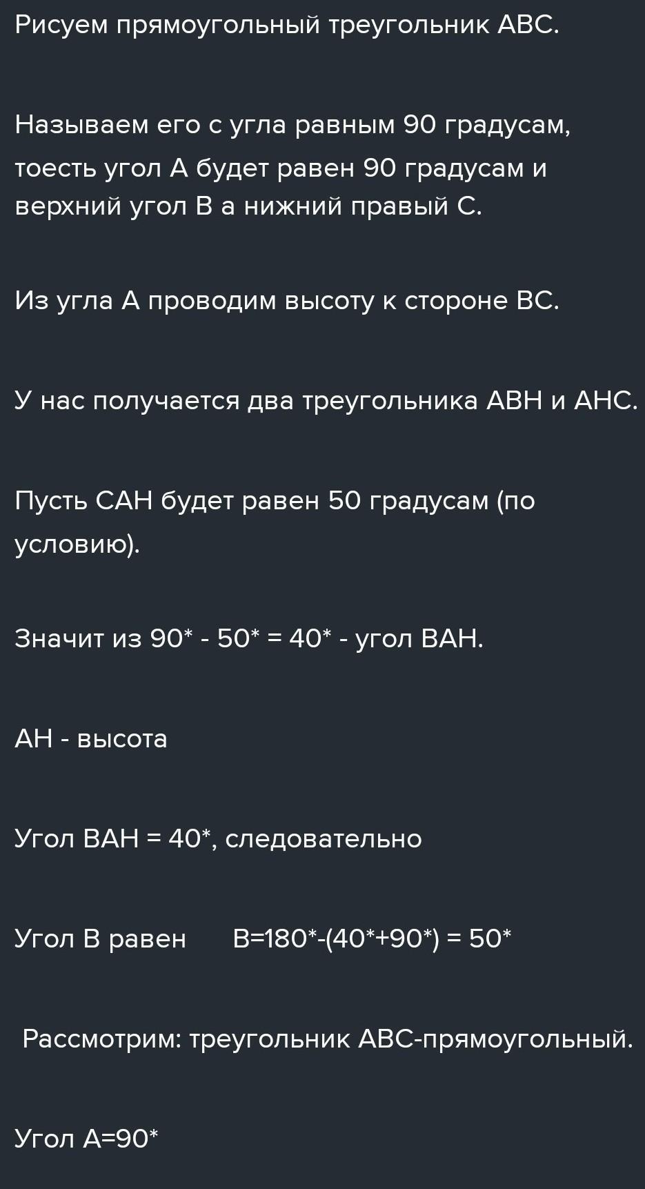 3. Найдите углы прямоугольного треугольника, если его высота, проведенная из вершины прямого угла, образует с катетом угол 55º