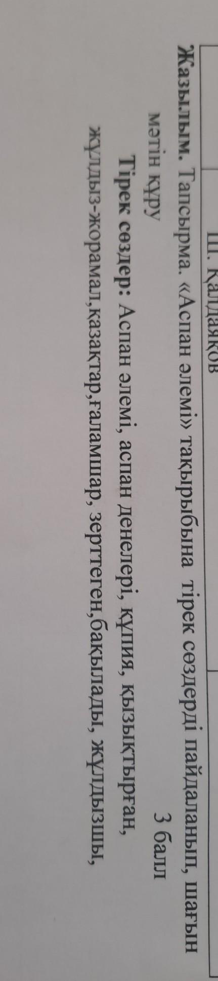 тапсырма "Аспан әлемі" тақырыбына тірек сөздерді пайдаланып, шағын мәтін кұру