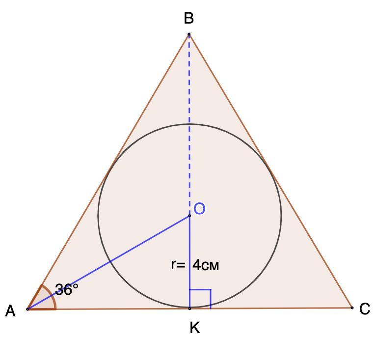 В равнобедренном треугольнике радиус вписанной окружности равен 4 см, а угол при основании 36°. Выразите основание.
