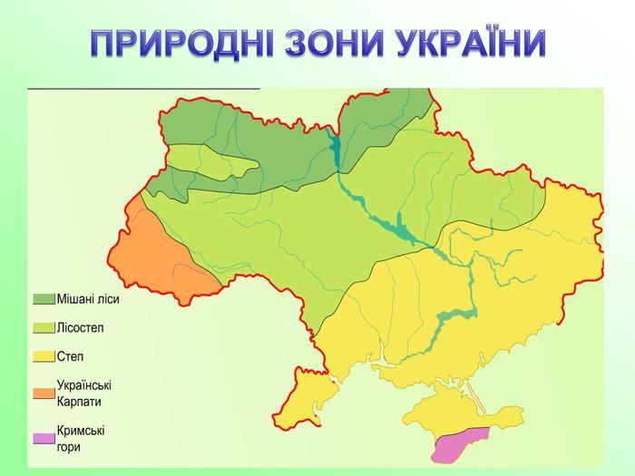 З півночі на південь змінюються такі природні зони: мішані ліси, лісостеп і степ, невелика ділянка України належить до субтропіків. Також на території України є два гірські райони: Карпати і Кримські гори.