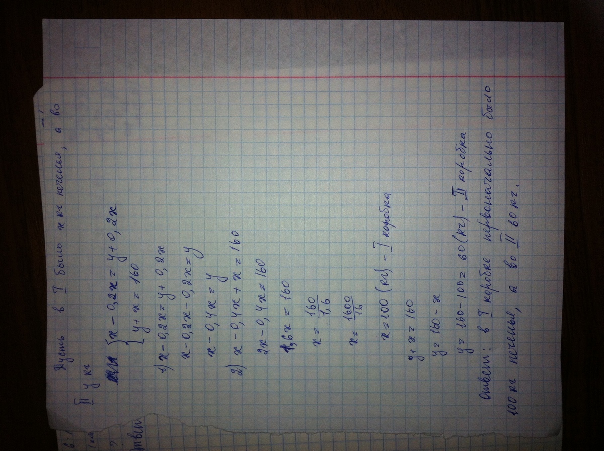 X+20%+X=160кг; Х+Х+20%=160кг;2Х+20%=160кг;2Х=160-20%;20%=32;2X=160-32;2X=128;x=64;короче в первой было 112кг а во второй 48