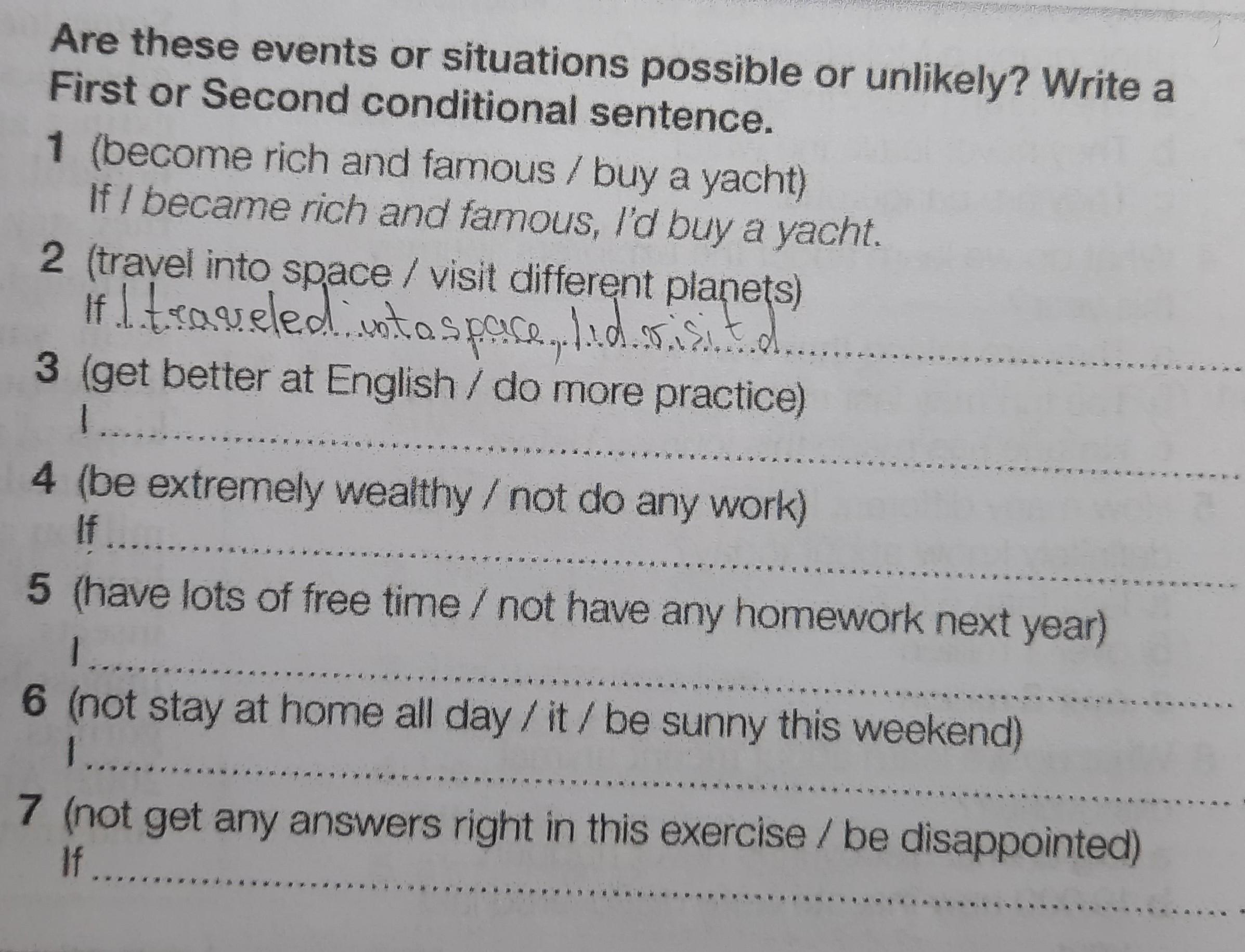 ‼️50 БАЛЛОВ‼️ Are these events or situations possible or unlikely? Write a First or Second conditional sentence. 1 (become rich and famous / buy a yacht) If I became rich and famous, I'd buy a yacht. 2 (travel into space / visit different planets) 3 (get better at English / do more practice) 4 (be extremely wealthy / not do any work) If 5 (have lots of free time / not have any homework next year) ............ 6 (not stay at home all day / it / be sunny this weekend) 7 (not get any answers right in this exercise / be disappointed) If