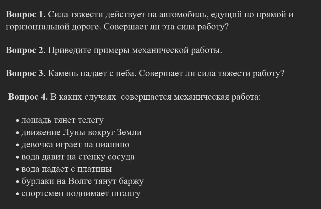 2.Рассмотрим примеры механической работы. Тележка передвигается под действием приложенной к ней силы. Сила совершает работу. При выстреле из ружья сила давления пороховых газов совершает работу – перемещает пулю вдоль ствола, скорость пули при этом увеличивается.