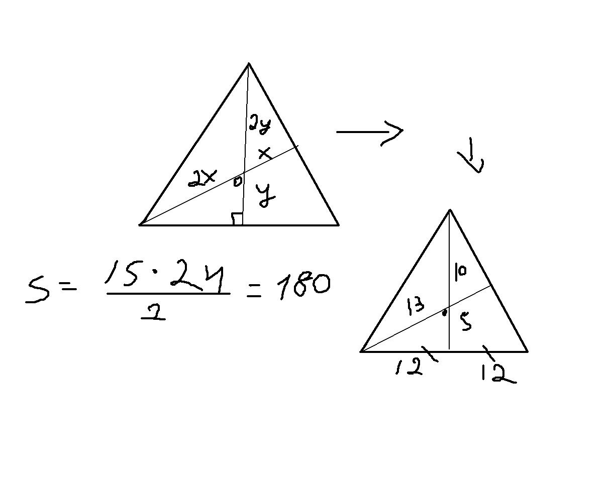 тогда ОА = 2х = 13, ОВ = 2У = 10,у = 5, вся медиана равна 15 см