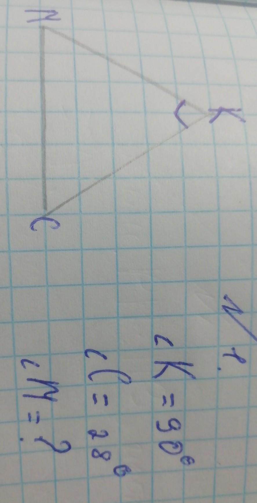 Оскільки сума гострих кутів прямокутного трикутника 90 градусів, тоді кут М= 90 - 28 = 62 градуса