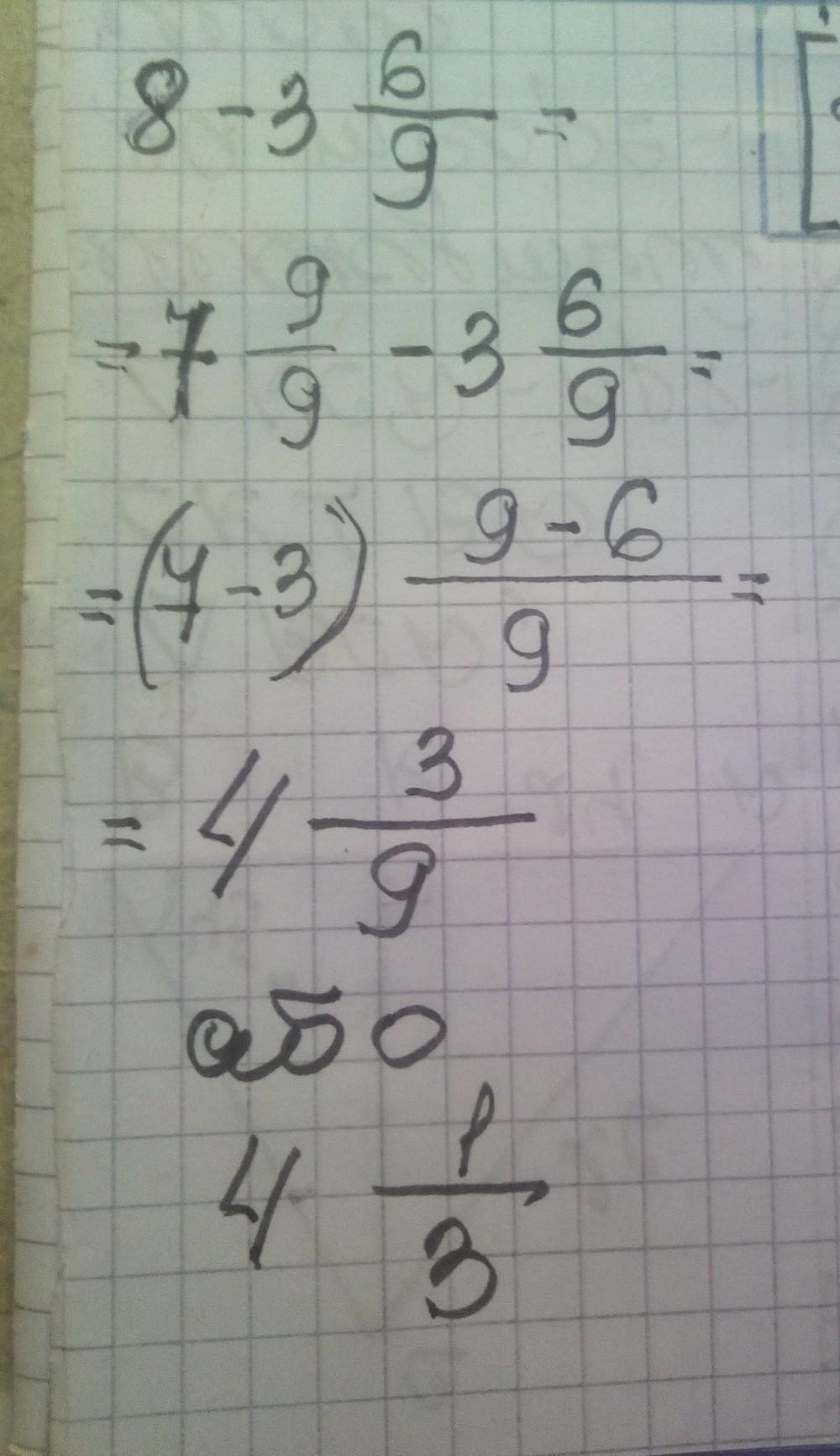 8 - 3 6/9 = 8 - (3 + 6/9) (розкладаємо 3 6/9 на суму 3 та 6/9, щоб можна було відняти)