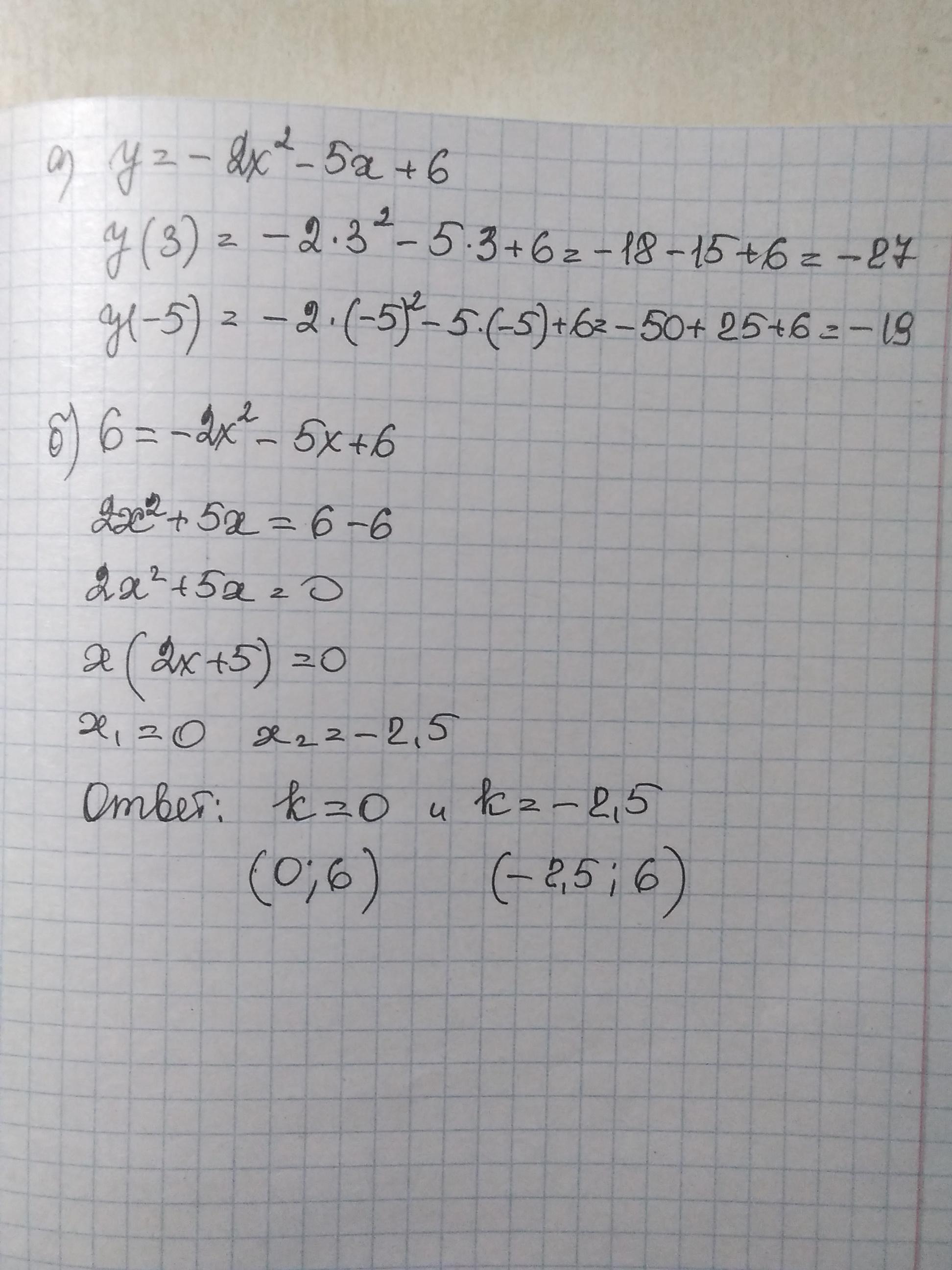 Дана функция y = -2x^2 - 5х +6 a) Найдите значения функции f (3) f (-5) Известно, что график функции проходит через точку (k; 6). b) Найдите значение k.