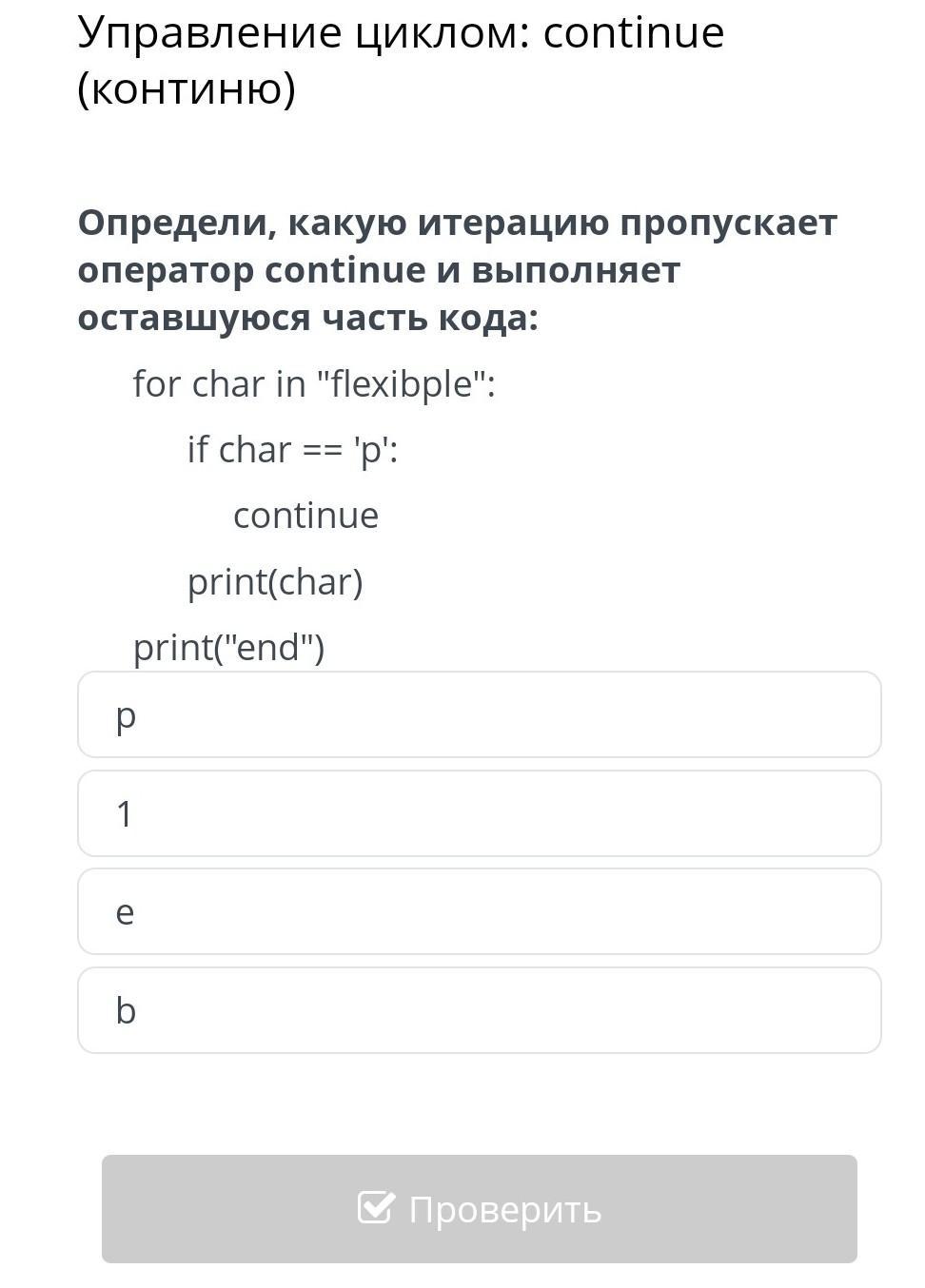 Определи, какую итерацию пропускает оператор continue и выполняет оставшуюся часть кода