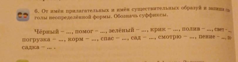 6. От имен прилагательных и имён существительных образуй и запиши голы неопределённой формы. Обозначь суффиксы. Чёрный -.. помог- - погрузка ..., корм садка *** *** 3 зелёный - ..., крик - .... полив - .... сад - ..., смотрю- спас ..., свет - пение - **** 2.