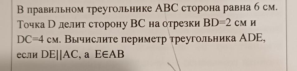 В правильном треугольнике АВС сторона равна 6 см. Точка D делит сторону ВС на отрезки BD=2 см и DC=4 см. Вычислите периметр треугольника ADE, если DЕ || AC, а точка Е принадлежит стороне АВ