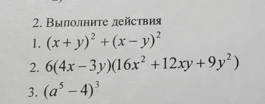 2. Выполните действия 1. (x + y)2 + (x - y)2 2. 6(4x-3y)(16x² + 12xy +9y²) 3. (a³ - 4)³
