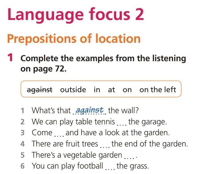 Language focus 2 Prepositions of location 1 Complete the examples from the listening on page 72. against outside in at on on the left 1 What's that against the wall? 3 2 We can play table tennis .... the garage. Come.... and have a look at the garden. 4 There are fruit trees.... the end of the garden. 5 There's a vegetable garden ..... 6 You can play football.... the grass.