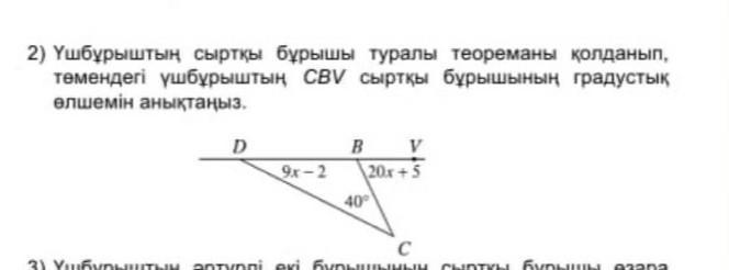 Используя теорему о внешнем угле /\-ТРЕУГОЛЬНИка определить внешнего угла СВV окружности находящееся внизу