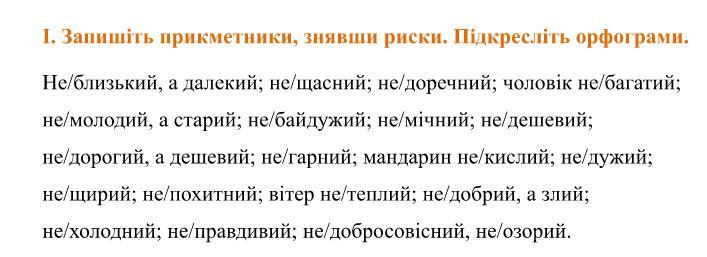 Не близький, а далекий, нещасний, недоречний, чоловік не багатий, не молодий, а старий, небайдужий, немічний, недешевий, не дорогий, а дешевий, негарний, мандарин не кислий, недужий, нещирий, непохитний, вітер не теплий, не добрий, а злий, не холодний, неправдивий, недобросовісний, неозорий.