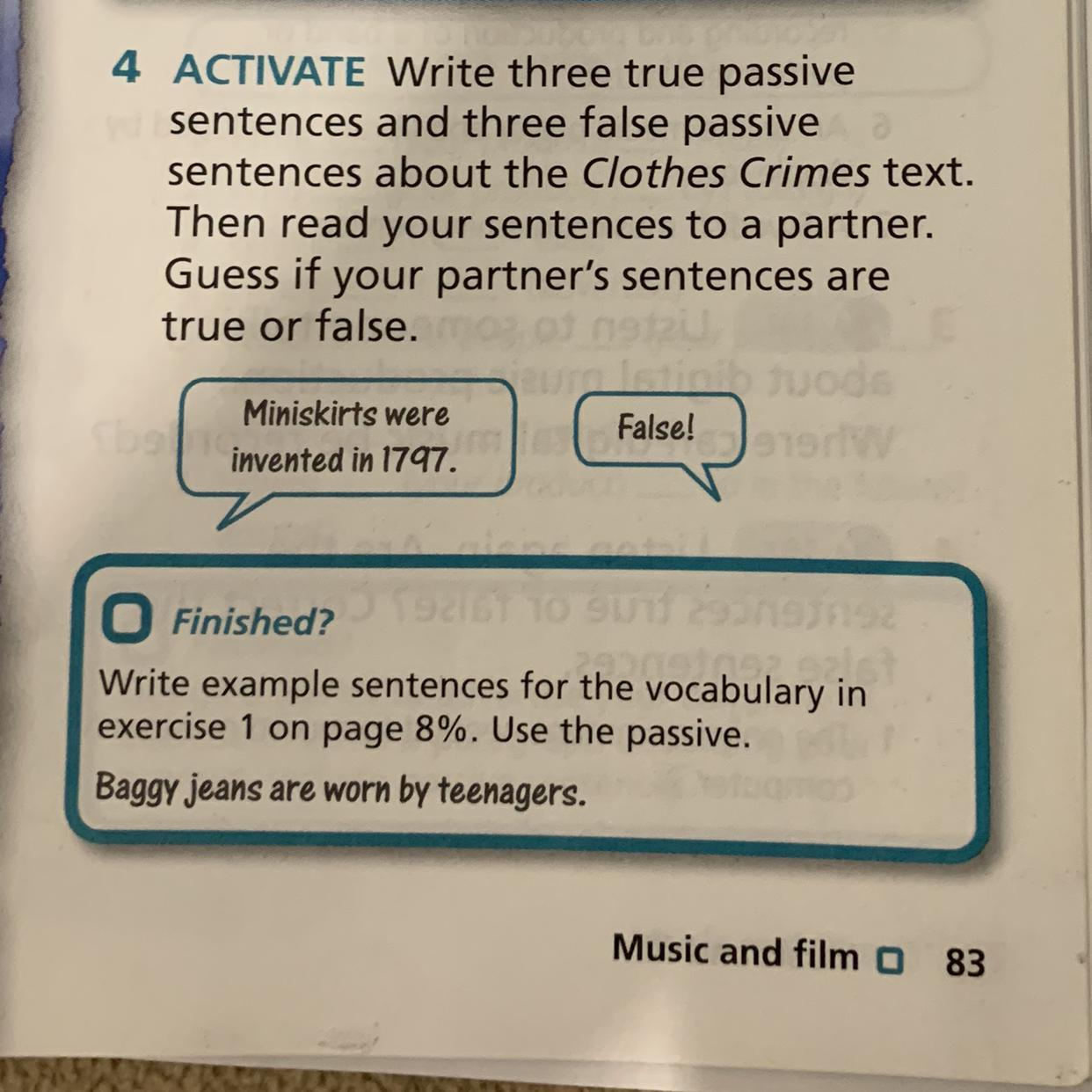 пж помогите ACTIVATE Write three true passive sentences and three false passive sentences about the Clothes Crimes text.