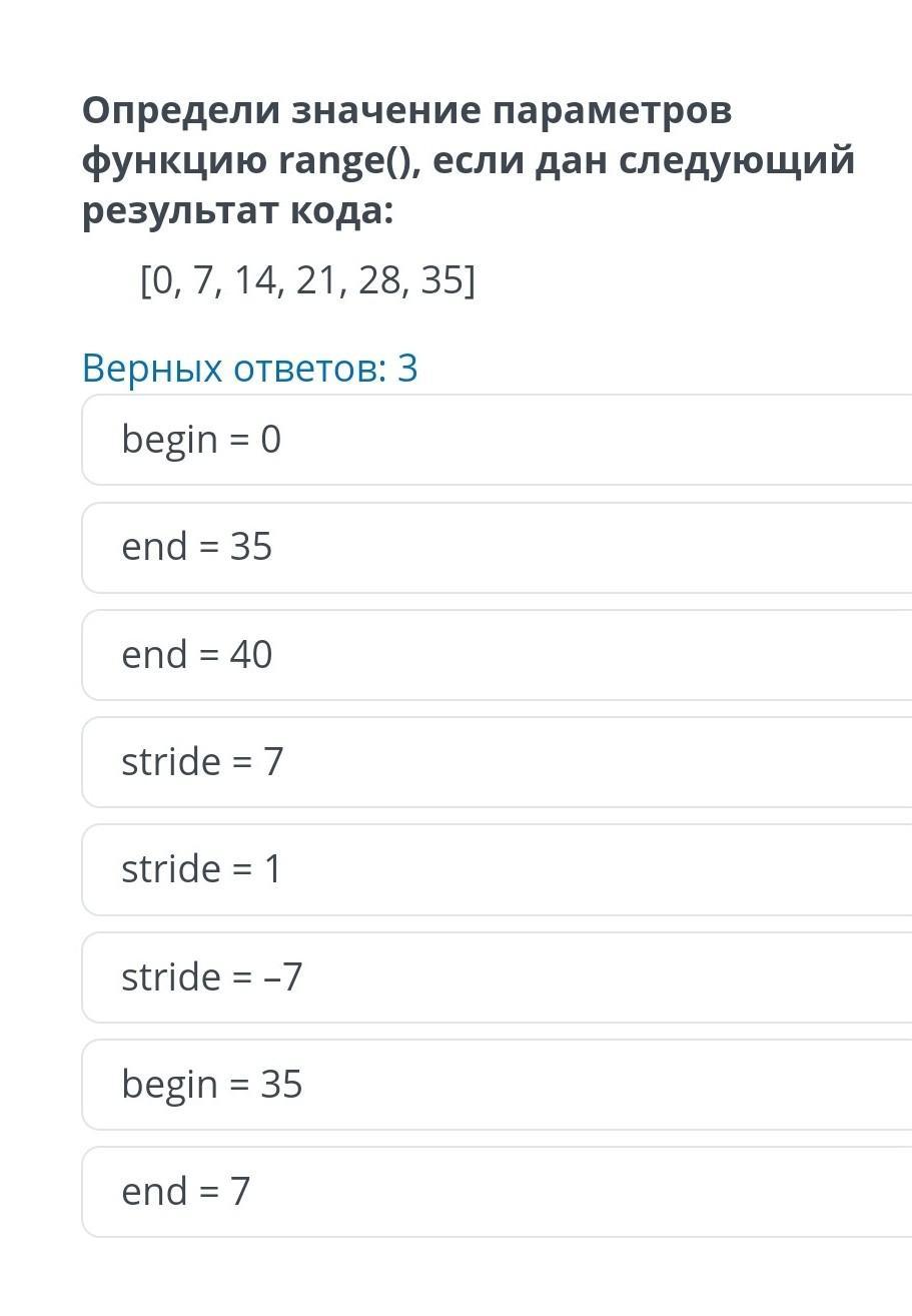 Определи значение параметров функцию range(), если дан следующий результат кода: [0, 7, 14, 21, 28, 35] Верных ответов: 3 begin = 0 end = 35 end = 40 stride = 7 stride = 1 stride = -7 begin = 35 end = 7