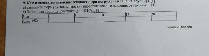 а) запишите формулу зависимости гидростатического давления от глубины. [1]