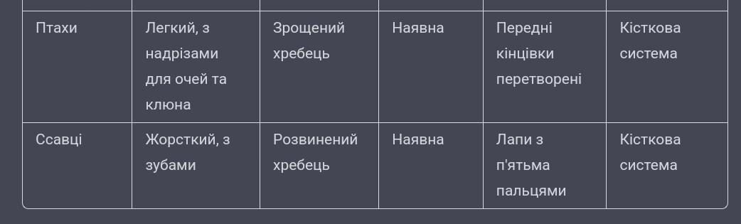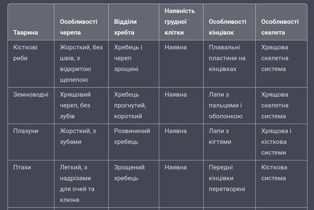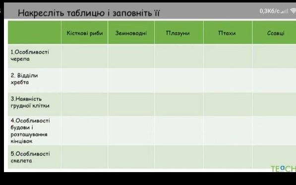 Накресліть таблицю і заповніть її 1.Особливості черепа 2. Вiддiли хребта 3 Наявність грудної клітки 4.Особливості будови і розташування кінцівок 5.Особливості скелета Kiстковi риби Земноводнi Плазуни Птахи Ссавці
