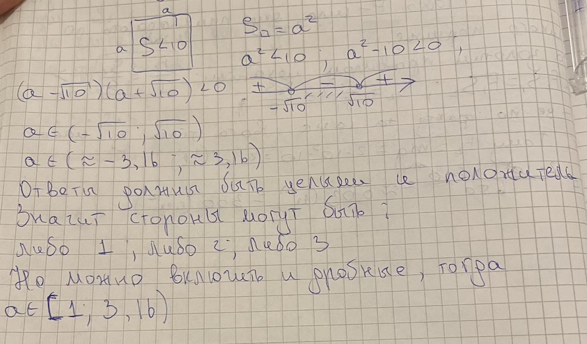 постройте квадрат со стороной 1 см, 2 см или 3 см на выбор, все их площади меньше 10 см кв.