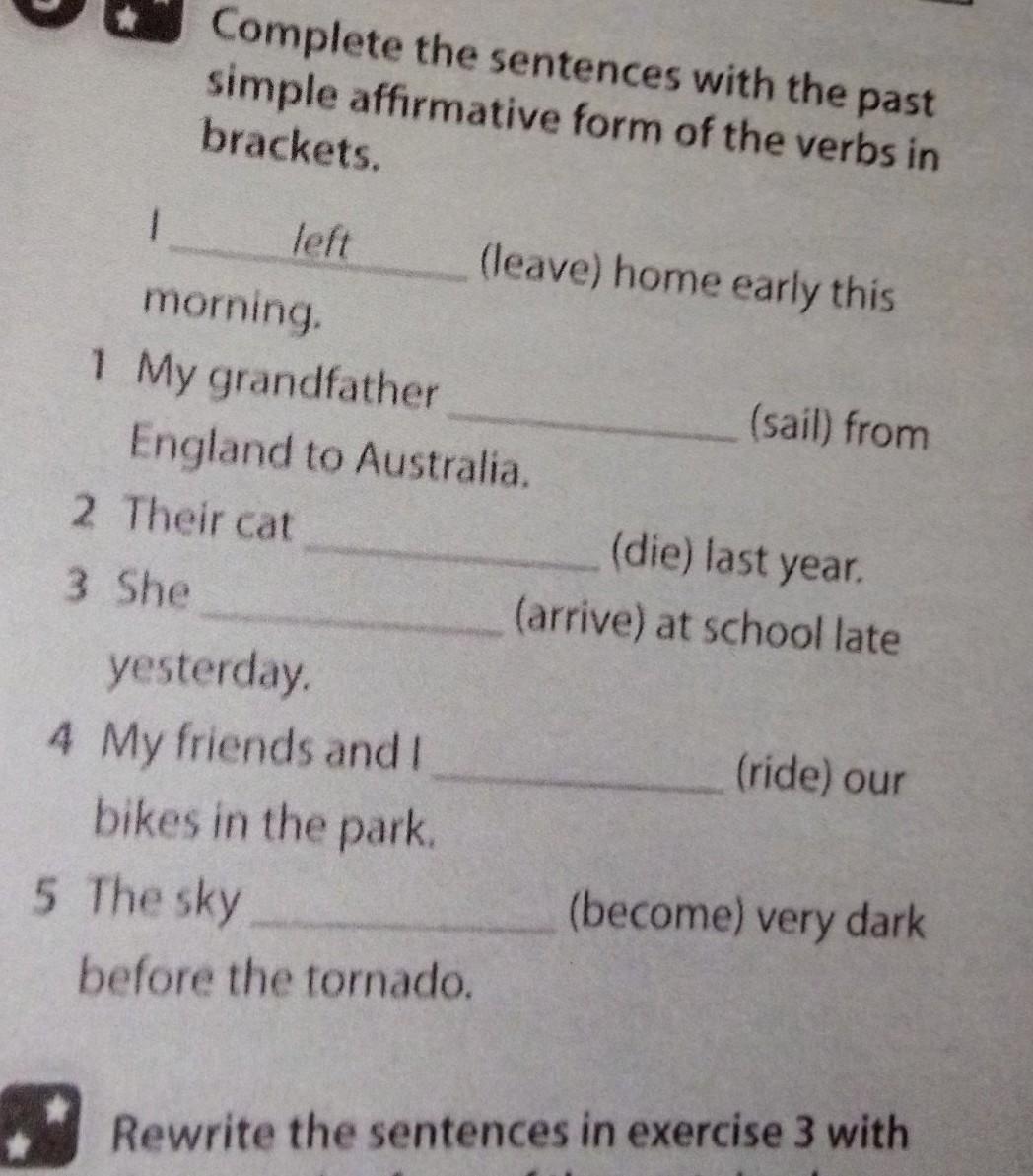 3 1 Complete the sentences with the past simple affirmative form of the verbs in brackets. left morning. 1 My grandfather England to Australia. 2 Their cat 3 She yesterday. 4 My friends and I bikes in the park. 5 The sky 8 before the tornado. (leave) home early this (sail) from (die) last year. (arrive) at school late (ride) our (become) very dark