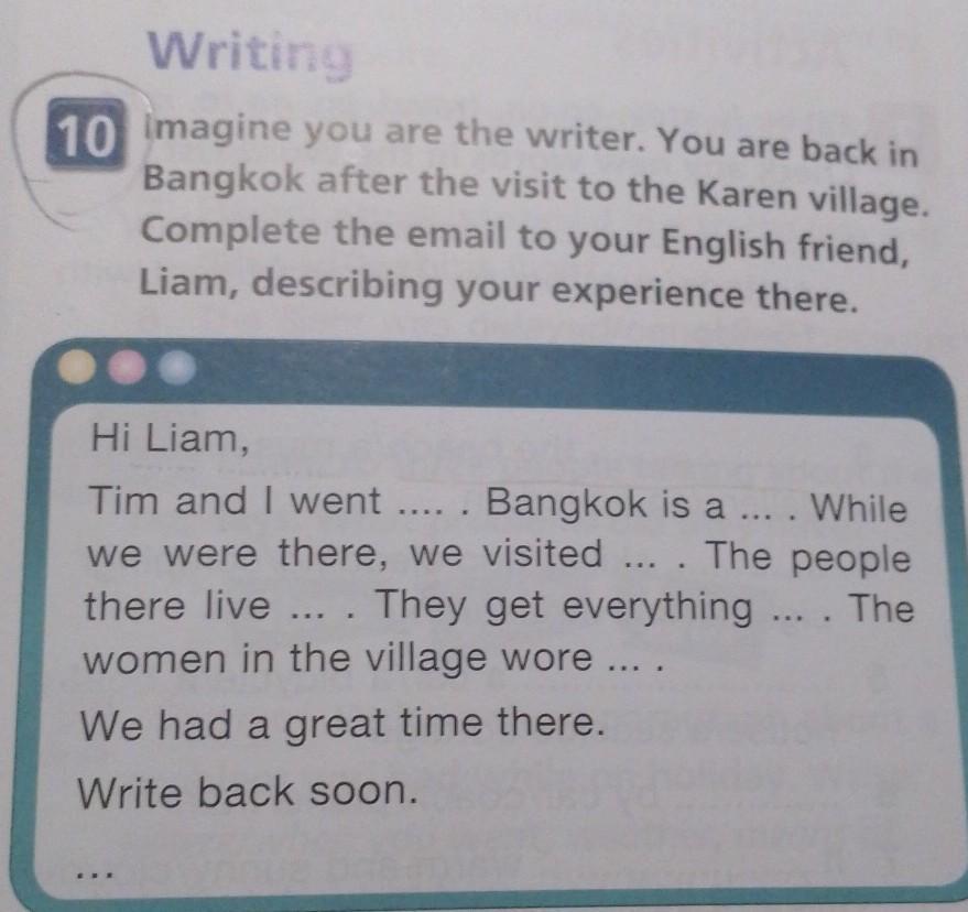 10 Imagine you are the writer. You are back in Bangkok after the visit to the Karen village. Complete the email to your English friend, Liam, describing your experience there. Hi Liam, Tim and I went Bangkok is a ... . While we were there, we visited .... The people there live.... They get everything.... The women in the village wore .... We had a great time there. Write back soon. ****