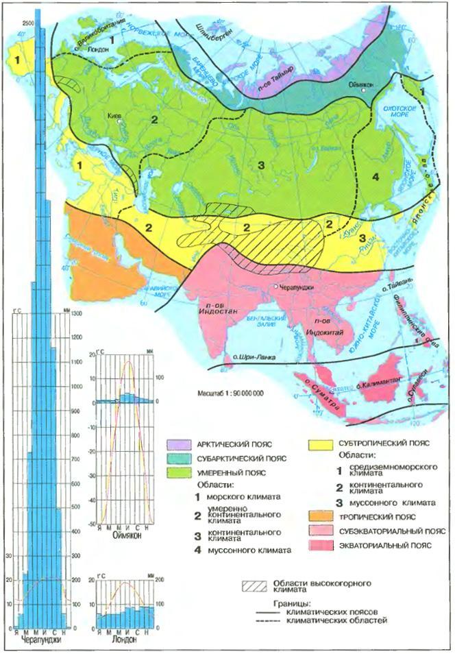 Як видно з карти типів клімату Євразії, яка дана нижче у додатку, в помірному кліматичному поясі виділяють наступні типи клімату (із заходу на схід):морський, помірно-континентальний, континентальний, мусонний.