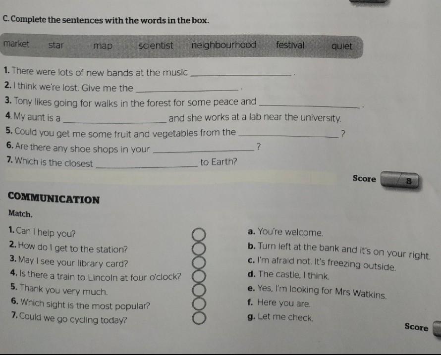 market star map scientist COMMUNICATION 1. There were lots of new bands at the music 2. I think we're lost. Give me the 3. Tony likes going for walks in the forest for some peace and 4. My aunt is a 5. Could you get me some fruit and vegetables from the 6. Are there any shoe shops in your 7. Which is the closest neighbourhood Match. 1. Can I help you? 2. How do I get to the station? 3. May I see your library card? 4. Is there a train to Lincoln at four o'clock? 5. Thank you very much. 6. Which sight is the most popular? 7. Could we go cycling today? and she works at a lab near the university. to Earth? festival ? quiet Score 8 a. You're welcome. b. Turn left at the bank and it's on your right. c. I'm afraid not. It's freezing outside. d. The castle, I think. e. Yes, I'm looking for Mrs Watkins. f. Here you are. g. Let me check. Score помогите пожалуйста