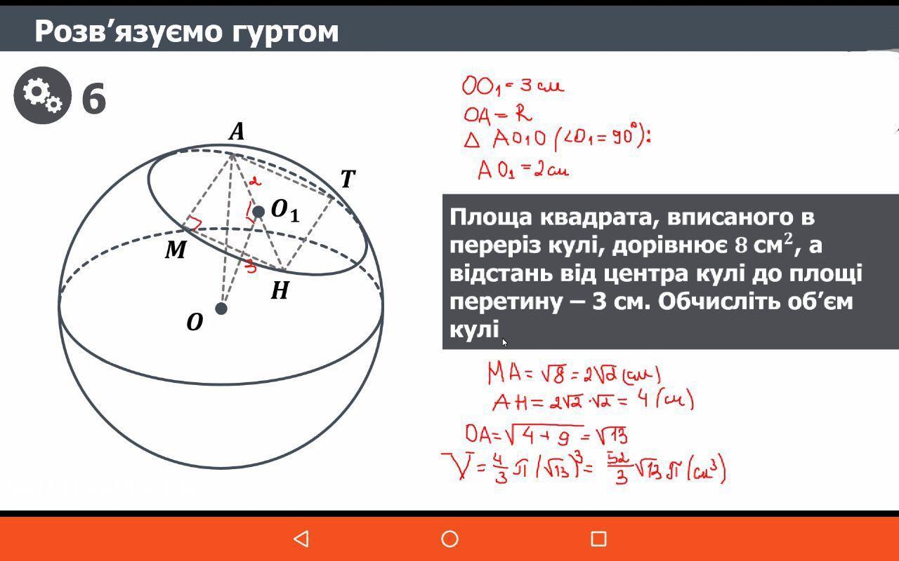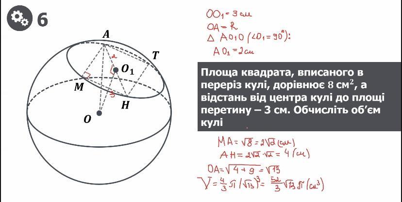 Площа квадрата, вписаного в переріз кулі, дорівнює 8 см2, а відстань від центра кулі до площі перетину – 3 см. Обчисліть об’єм кулі.