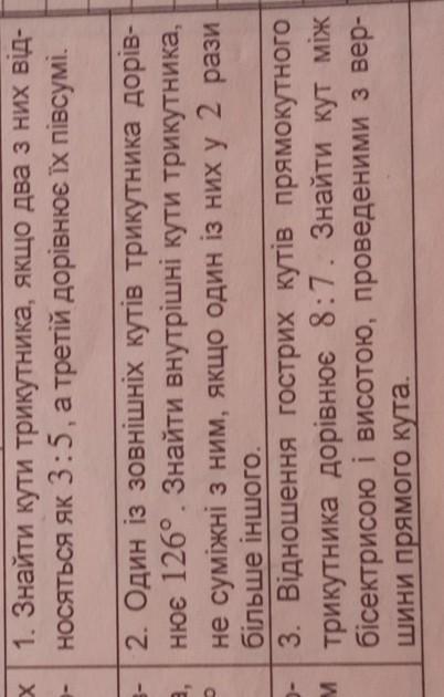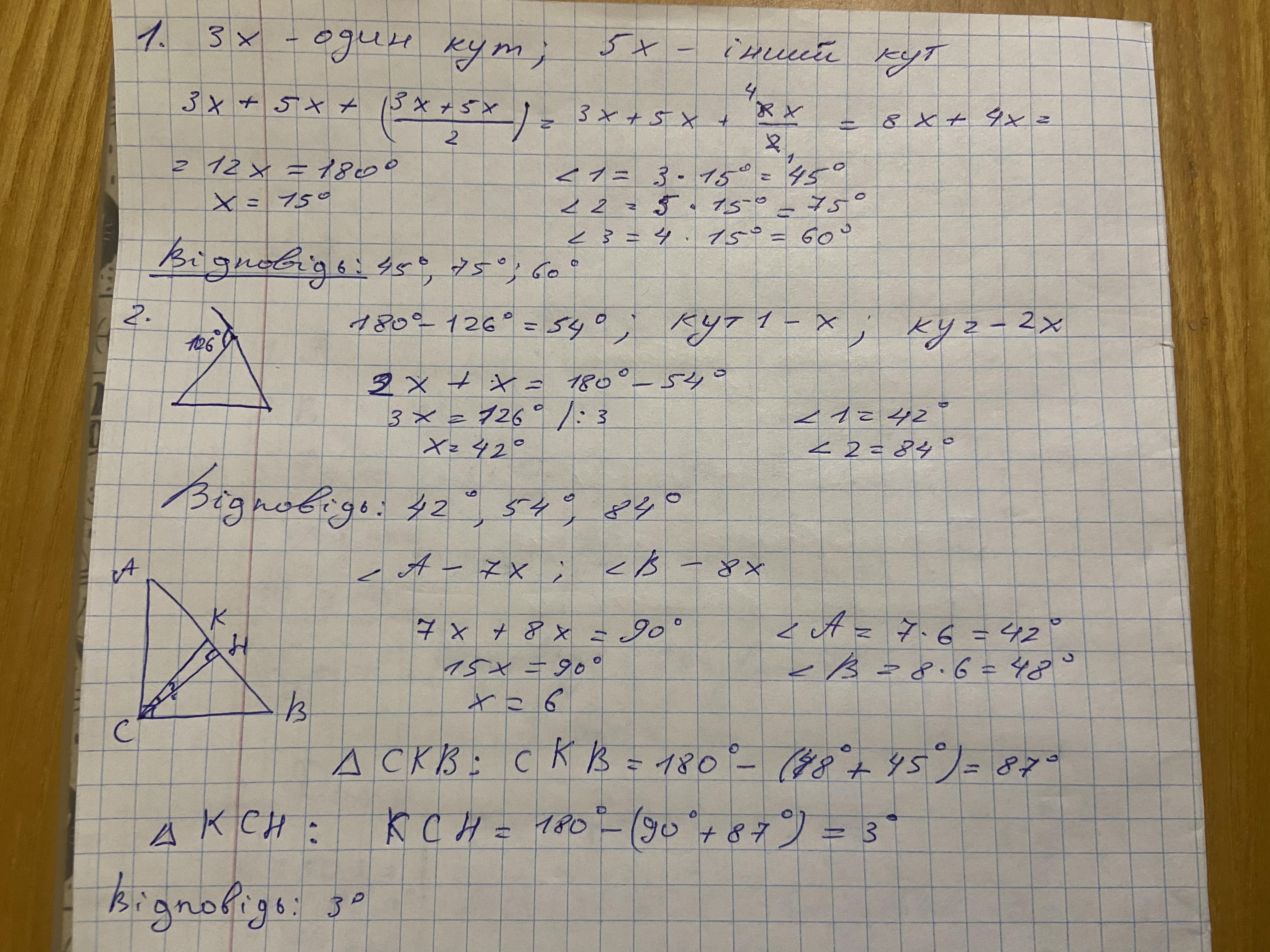1) Загалом, відомо, що сума всіх кутів трикутника дорівнює 180 градусам. Тому, маємо рівняння:
