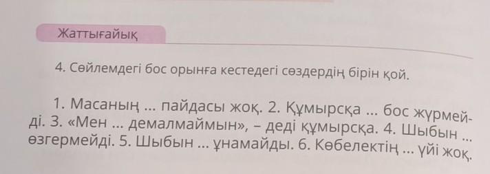 Сөйлемдегі бос орынға кестедегі сөздердің бірін қой.
