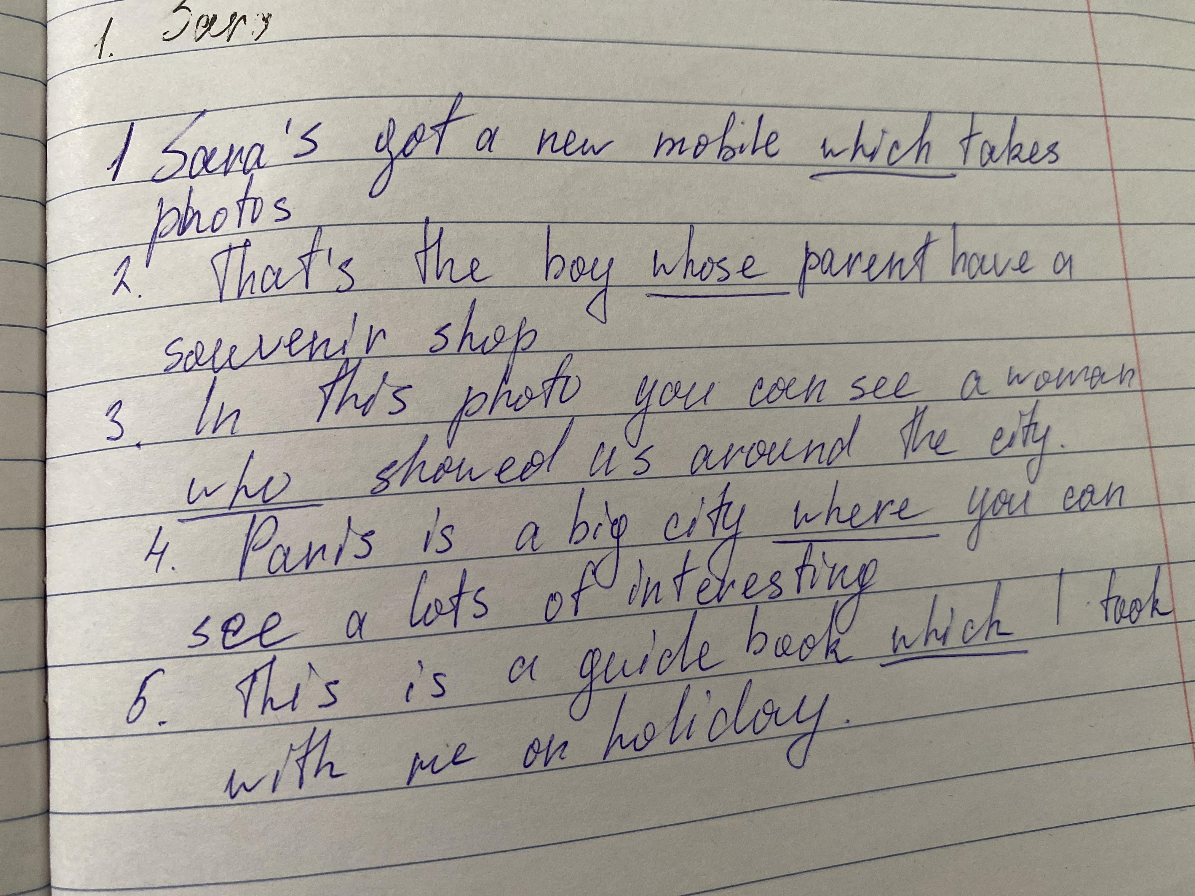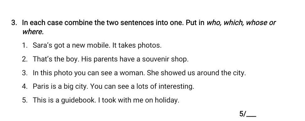3. In each case combine the two sentences into one. Put in who, which, whose or where. 1. Sara's got a new mobile. It takes photos. 2. That's the boy. His parents have a souvenir shop. 3. In this photo you can see a woman. She showed us around the city. 4. Paris is a big city. You can see a lots of interesting. 5. This is a guidebook. I took with me on holiday. 5/- срочно сто балов дам