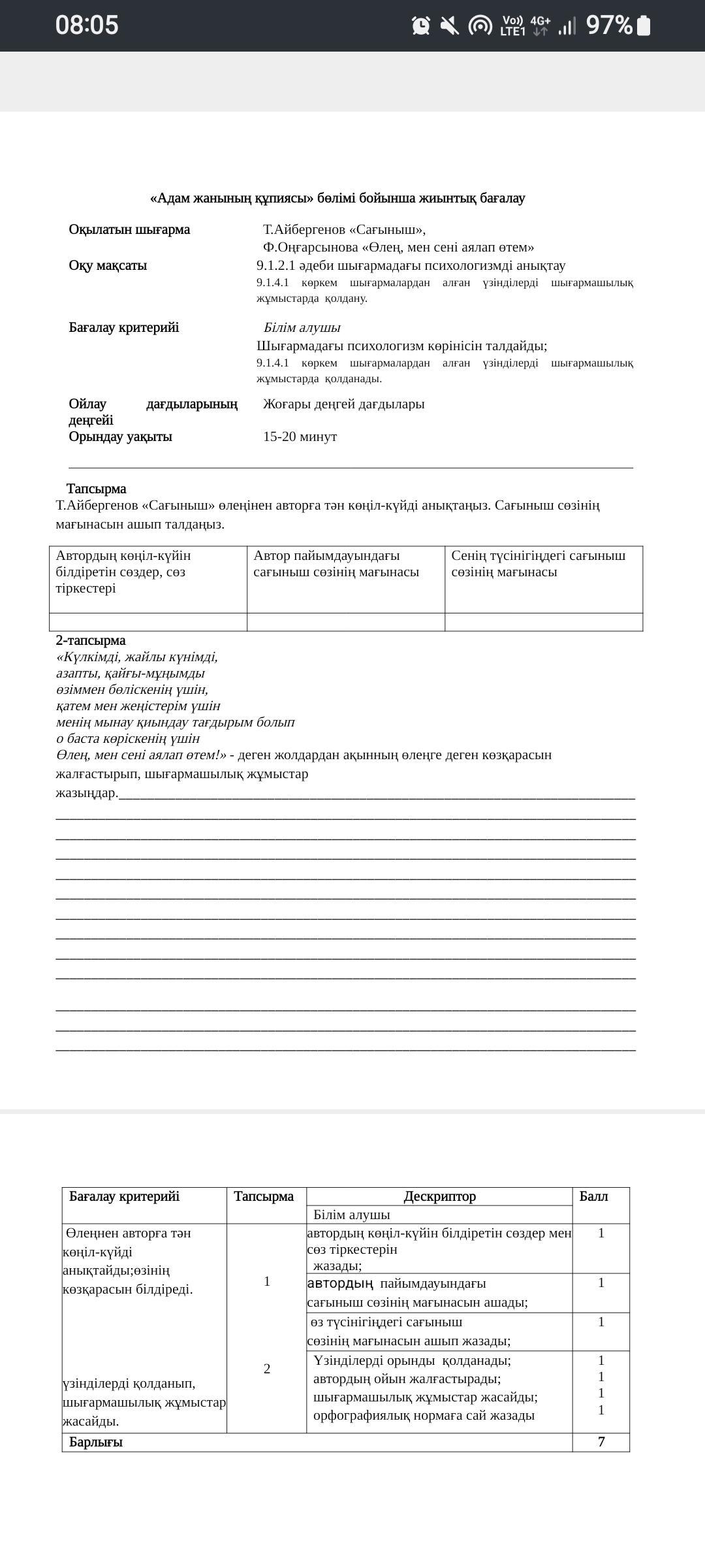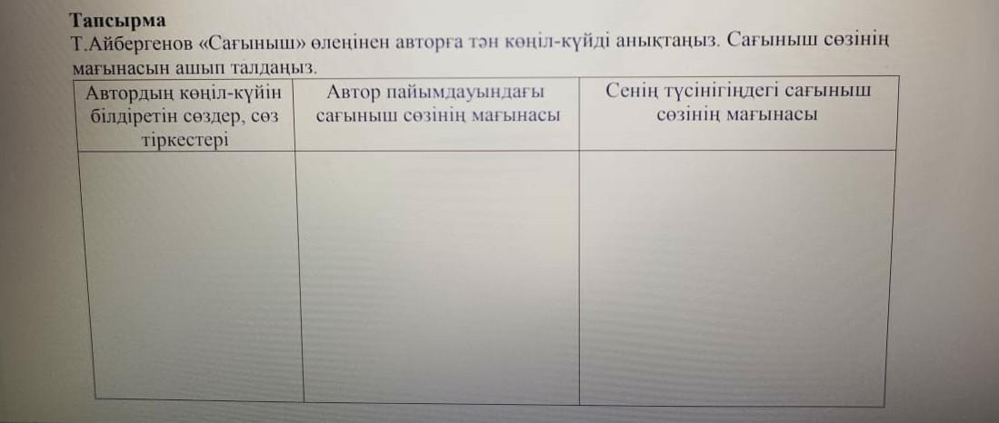 Тапсырма Т.Айбергенов «Сагыныш» өлеңінен авторға тән көңіл-күйді анықтаңыз. Сағыныш сөзінің мағынасын ашып талдаңыз. Автордың көңіл-күйін бiлдiретiн сөздер, сөз тіркестерi Автор пайымдауындағы сагыныш сөзiнiн магынасы Сенiн түсiнiгiндегi сагыныш сөзінің мағынасы