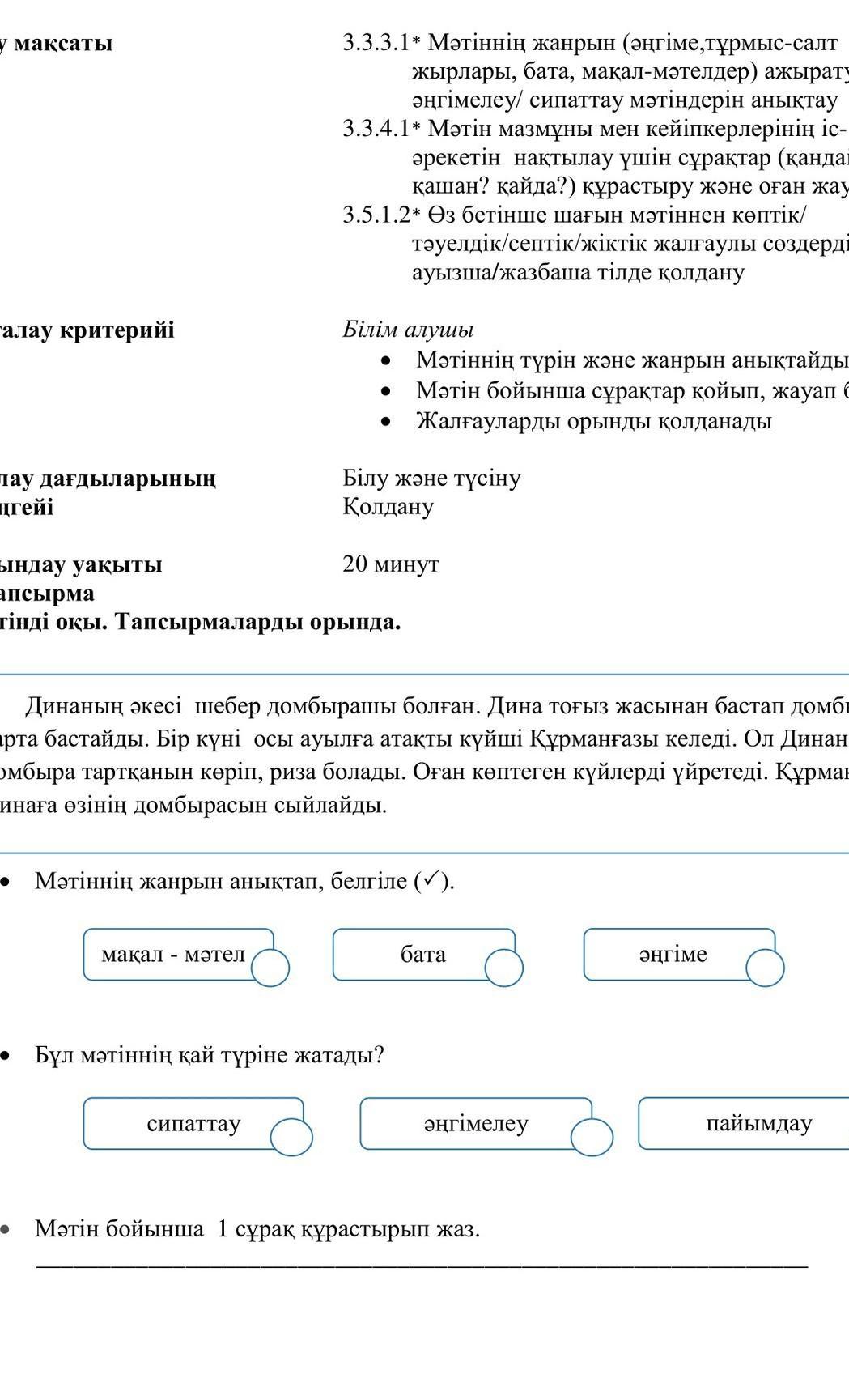 1)ангыме, 2) ангымелеу 3) Сурак "Дина неше жасынан бастап домбыра шерте бастады "?