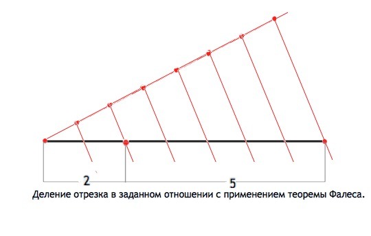 Можно на заданном отрезке откладывать не 7 отрезков, а провести всего 2 прямые - через седьмую и параллельно ей через вторую точку. Заданный отрезок будет разделён в нужном отношении.