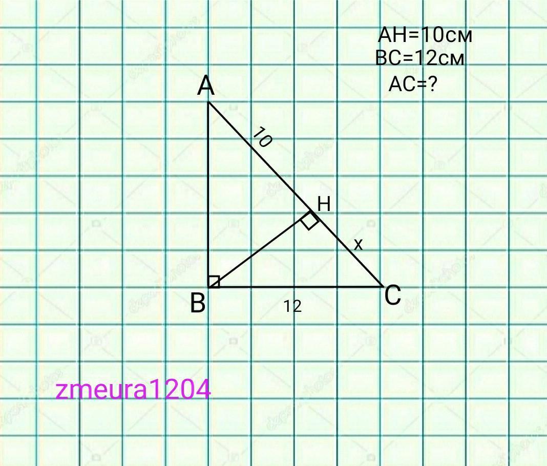 Один из катетов прямоугольного треугольника равен 12 см. а проекция второго катета на гипотенузу равна 10 см. Найдите гипотенузу. (обязателен рисунок данного треугольника)