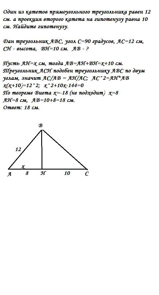 Один из катетов прямоугольного треугольника равен 12 см. а проекция второго катета на гипотенузу равна 10 см. Найдите гипотенузу. (обязателен рисунок данного треугольника)