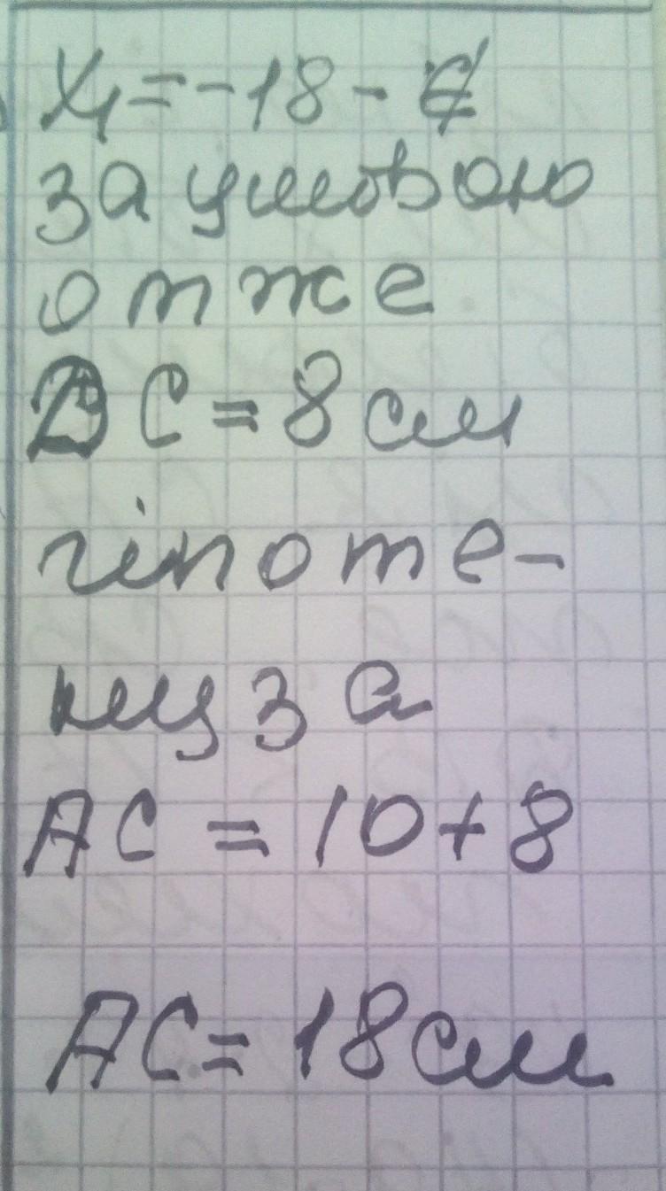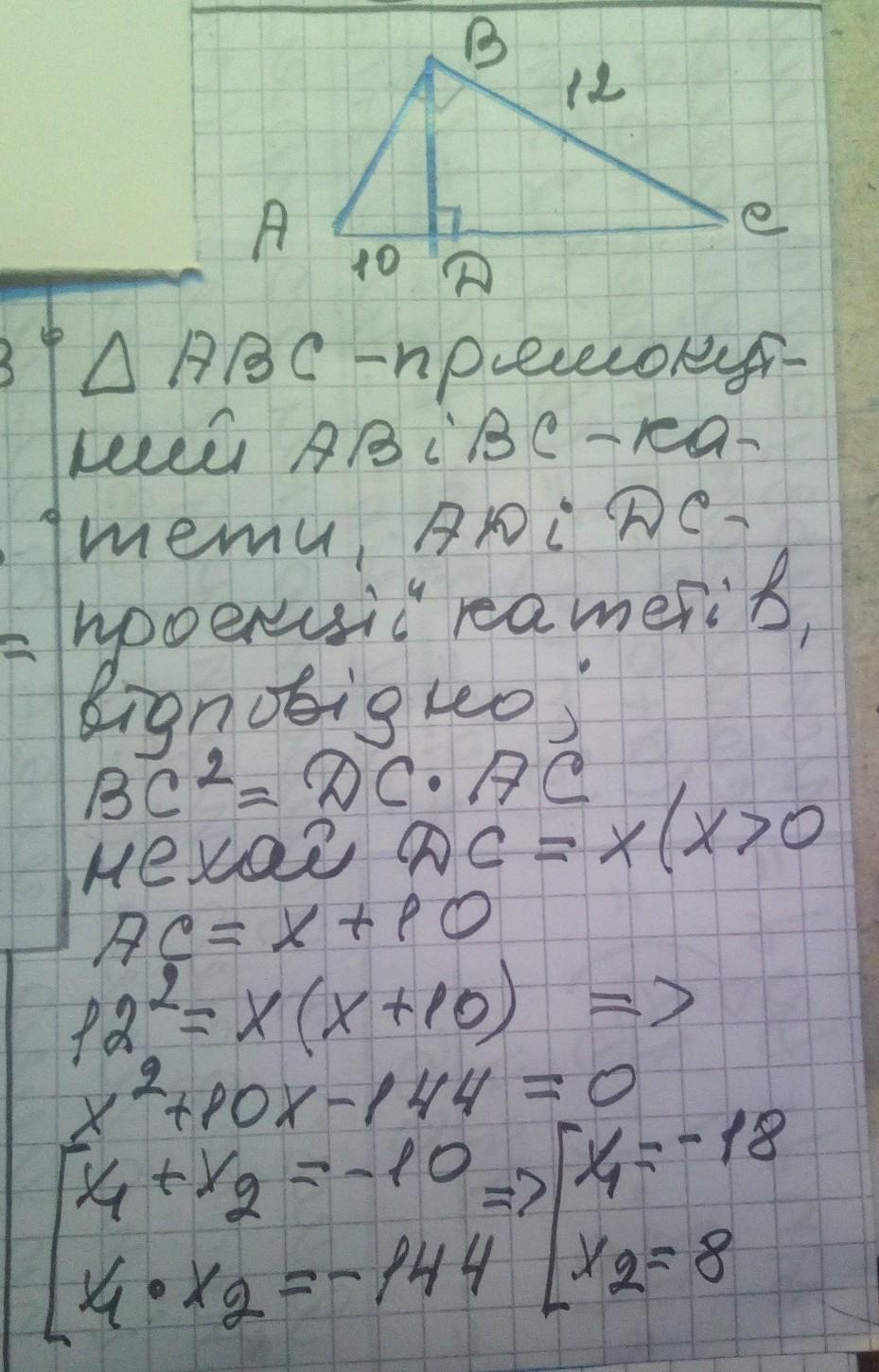 Один з катетів прямокутного трикутника дорівнює 12 см. а проекція другого катета на гіпотенузу дорівнює 10 см. Знайдіть гіпотенузу. (обов'язково малюнок цього трикутника)