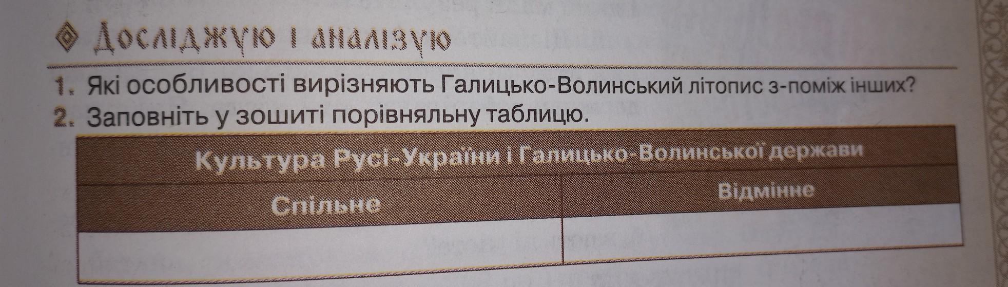 1. Які особливості вирізняють Галицько-Волинський літопис з-поміж інших? 2. Заповніть у зошиті порівняльну таблицю.