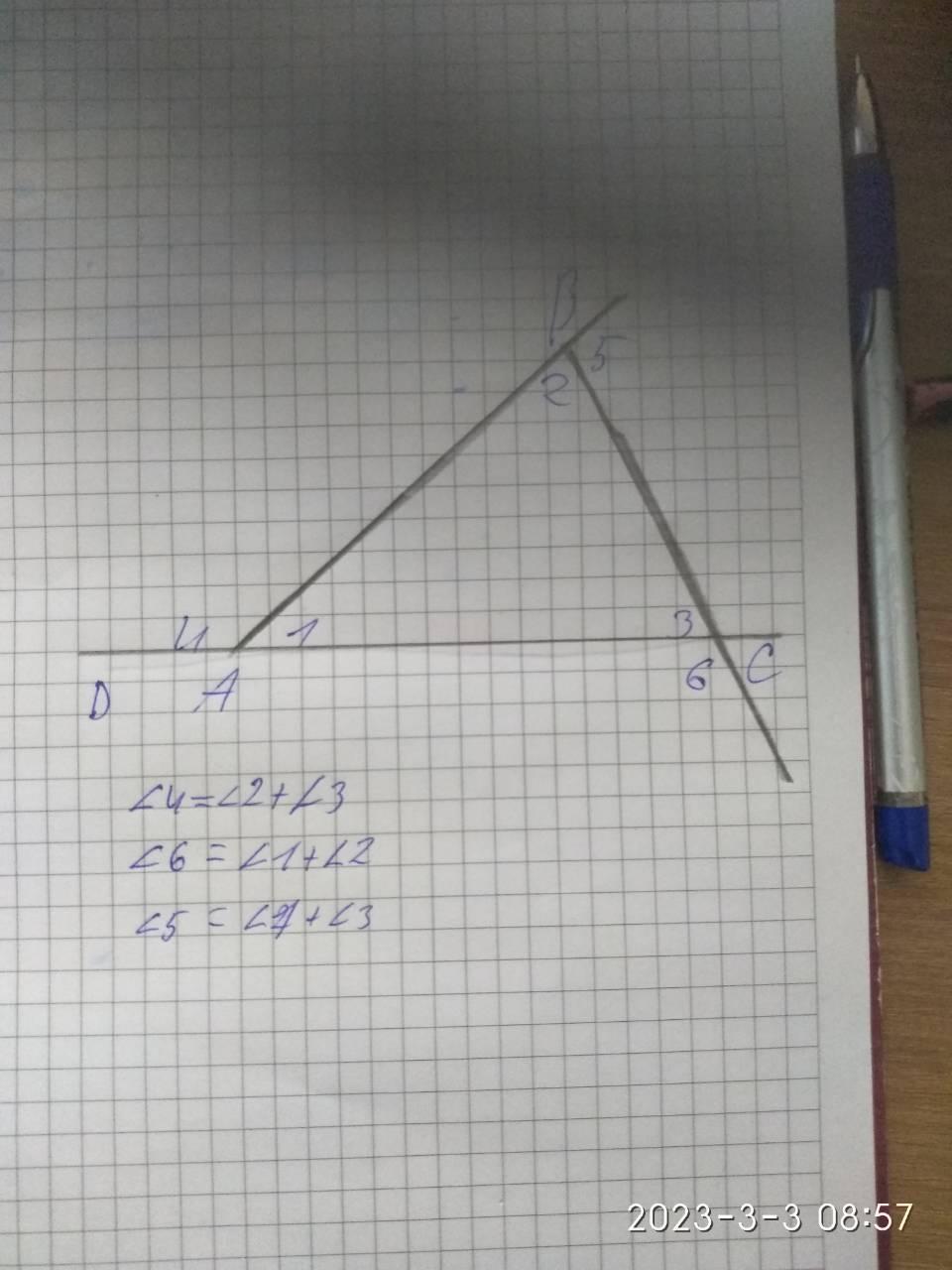 Відповідь: Зовнішній кут трикутника дорівнює сумі двох внутрішніх кутів, не суміжним з ним.