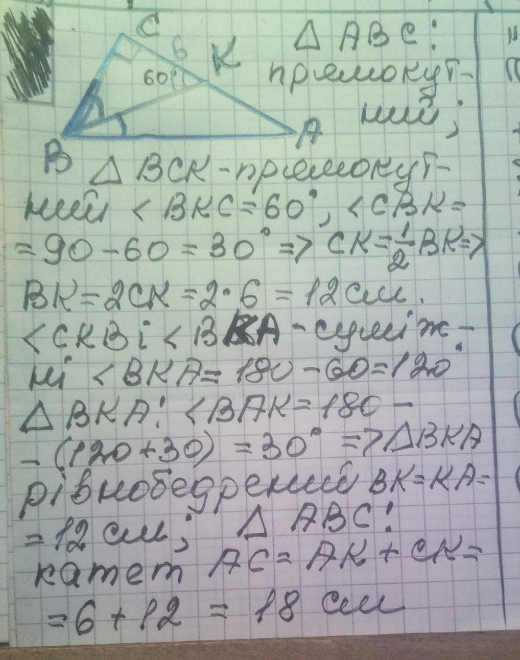 ДАМ 90 БАЛІВ!!! У трикутнику ABC кут С дорівнює 90° . Бісектриса ВК утворює з катетом АС кут 60 ° . Знайдіть катет АС , якщо СК дорівнює бсм РИСУНОК ДОДАТИ!!!!