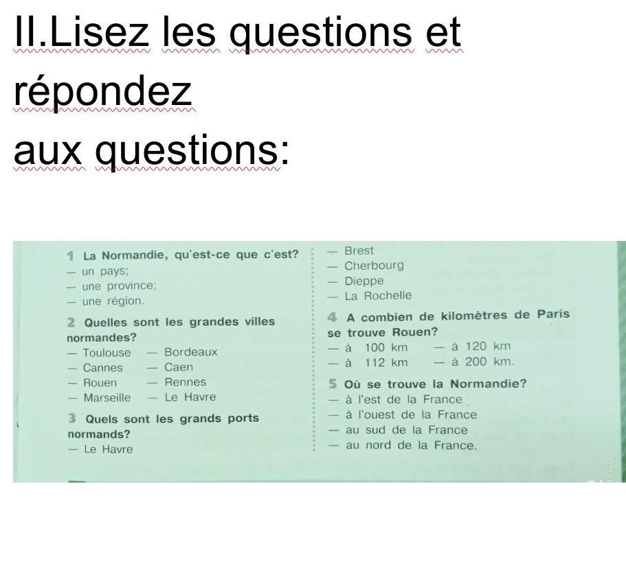 II.Lisez les questions et répondez aux questions: mmmmm 1 La Normandie, qu'est-ce que c'est? un pays; - une province; - une région. 2 Quelles sont les grandes villes normandes? Toulouse Cannes - Rouen Bordeaux Caen Rennes Marseille - Le Havre 3 Quels sont les grands ports normands? - Le Havre Brest Cherbourg Dieppe La Rochelle 4 A combien de kilomètres de Paris se trouve Rouen? - à 100 km à 112 km à 120 km - à 200 km. 5 Où se trouve la Normandie? - à l'est de la France à l'ouest de la France au sud de la France au nord de la France. пожалуйста срочно дам 40 балов
