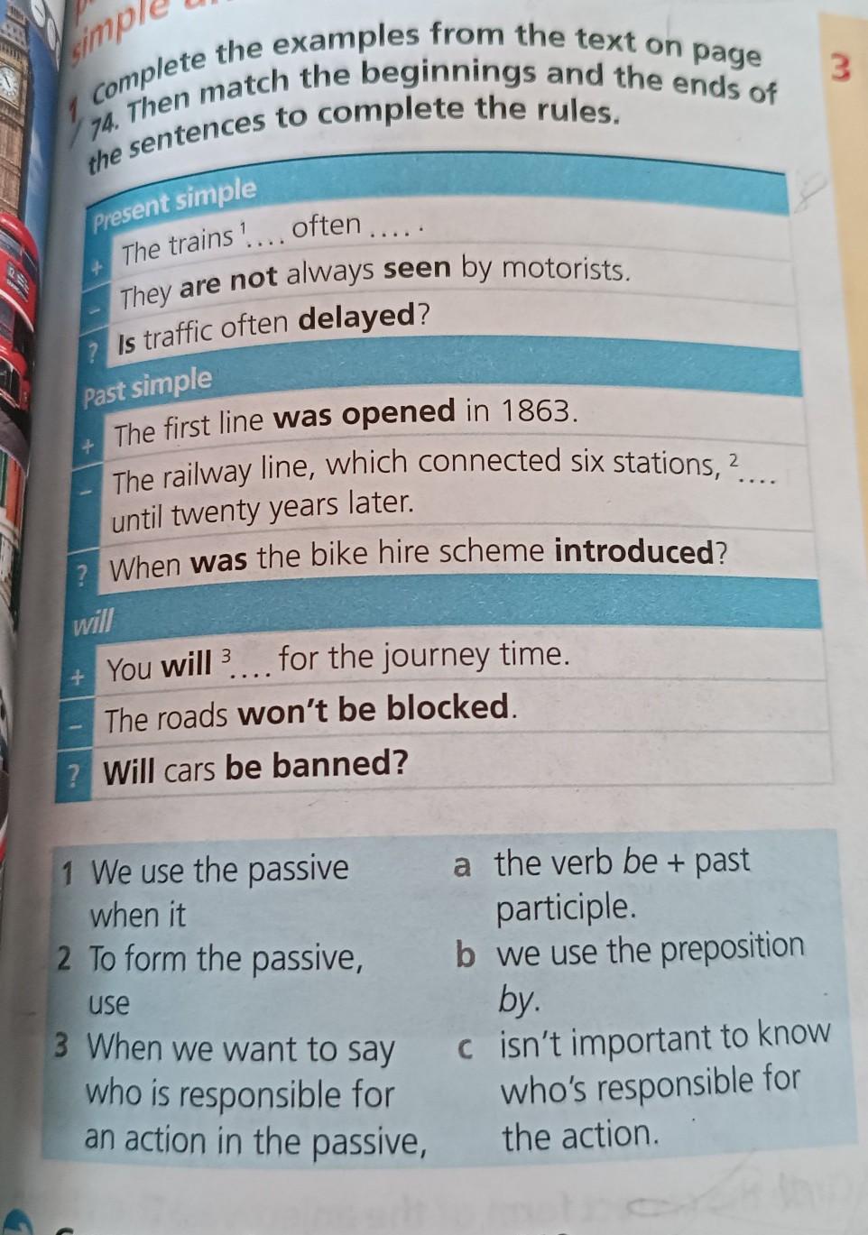 Complete the examples from the text on page 74. Then match the beginnings and the ends of the sentences to complete the rules. Present simple The trains.... often..... They are not always seen by motorists. Is traffic often delayed? Past simple The first line was opened in 1863. The railway line, which connected six stations, ² until twenty years later. ? When was the bike hire scheme introduced? will You will 3.... for the journey time. The roads won't be blocked. ? Will cars be banned? 1 We use the passive when it 2 To form the passive, use 3 When we want to say who is responsible for an action in the passive, **** a the verb be + past participle. b we use the preposition by. c isn't important to know who's responsible for the action.