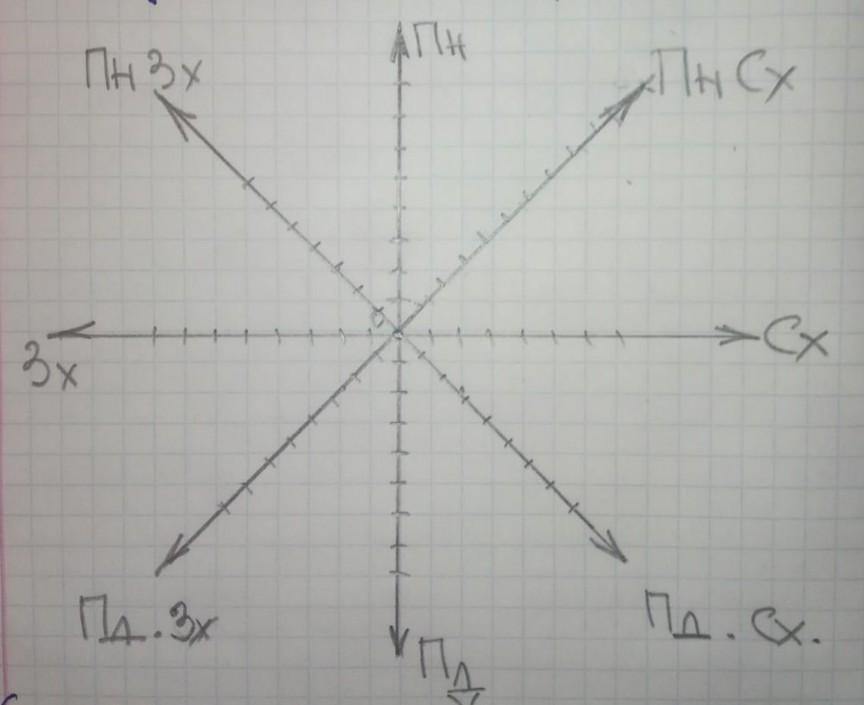 Малюємо на ньому осі координат, позначаємо їх буквами (зверху північ, внизу південь, справа схід, зліва захід).