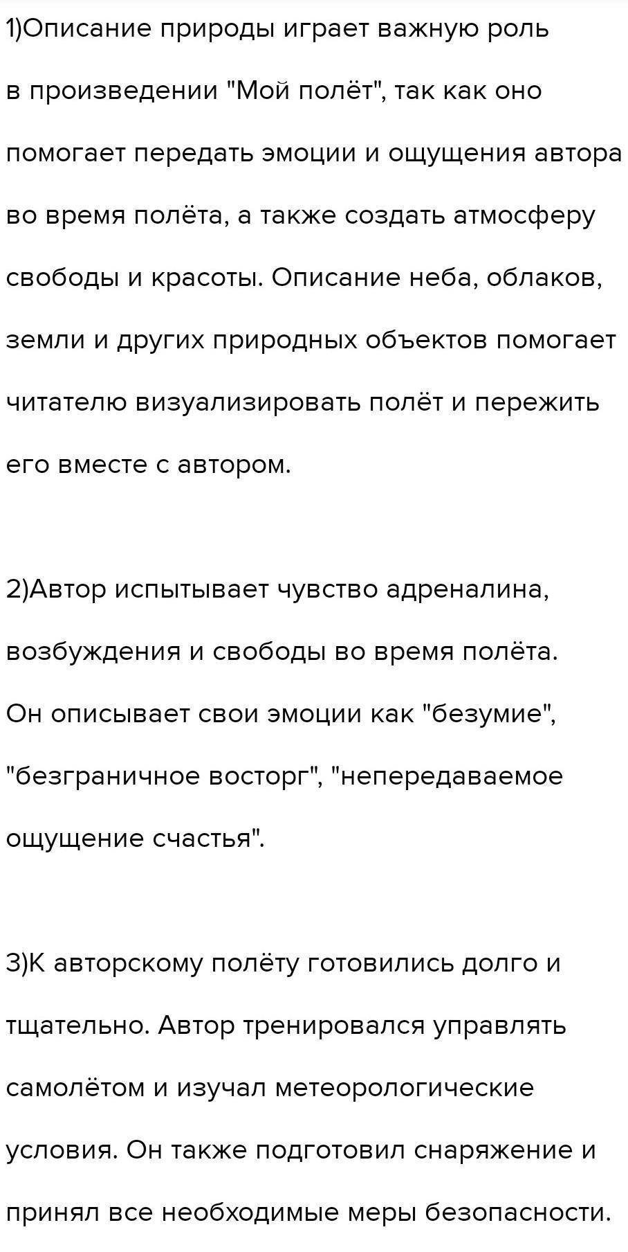 1)Описание природы играет важную роль в произведении "Мой полёт", так как оно помогает передать эмоции и ощущения автора во время полёта, а также создать атмосферу свободы и красоты. Описание неба, облаков, земли и других природных объектов помогает читателю визуализировать полёт и пережить его вместе с автором.