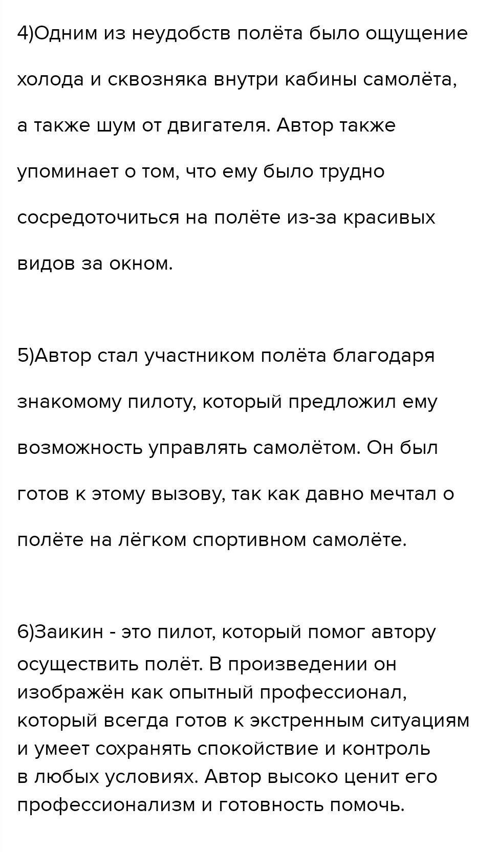 5)Автор стал участником полёта благодаря знакомому пилоту, который предложил ему возможность управлять самолётом. Он был готов к этому вызову, так как давно мечтал о полёте на лёгком спортивном самолёте.