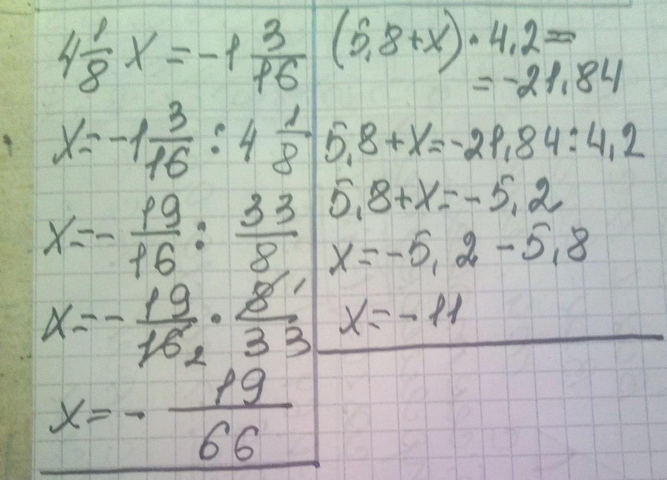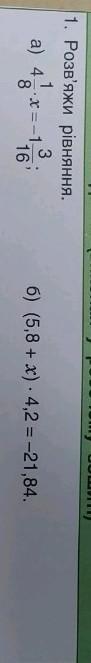 1. Розв'яжи 1 рiвняння. 3 16' a) 4-x=- -1- 8 6) (5,8 + x) 4,2 = -21,84.