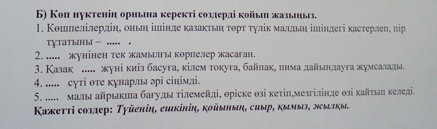 Б) Көп нүктенің орнына керекті сөздерді қойып жазыңыз. 1. Көшпелілердің, оның ішінде қазақтың төрт түлік малдың ішіндегі кастерлеп, пір тұтатыны - 2. ..... жүнінен тек жамылғы көрпелер жасаған. 3. Қазақ жүні киіз басуға, кілем тоқуға, байпақ, пима дайындауға жұмсалады. 4. ..... сүті өте құнарлы әрі сіңімді. 5. ..... малы айрықша бағуды тілемейді, өріске өзі кетіп,мезгілінде өзi кайтып келеді. Қажетті сөздер: Түйенің, ешкінің, қойының, сиыр, қымыз, жылқы. ..... ..... ● ПОМОГИТЕ ДАМ 100 БАЛОВ