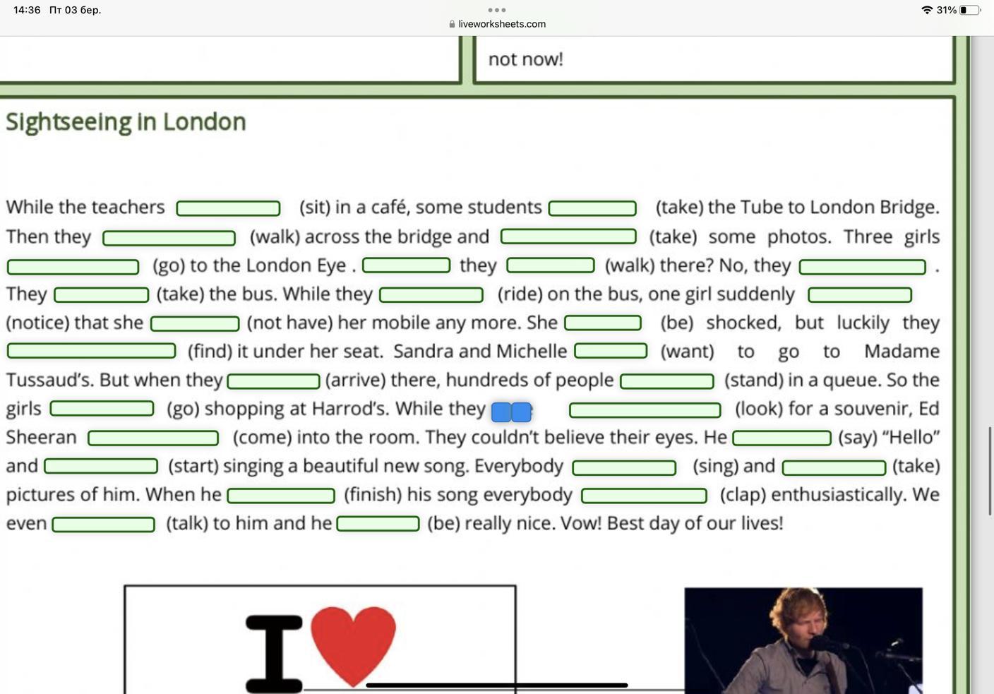 was shopping, looked, came, said, he started, were singing, taking, finished, were clapping, talked, was.