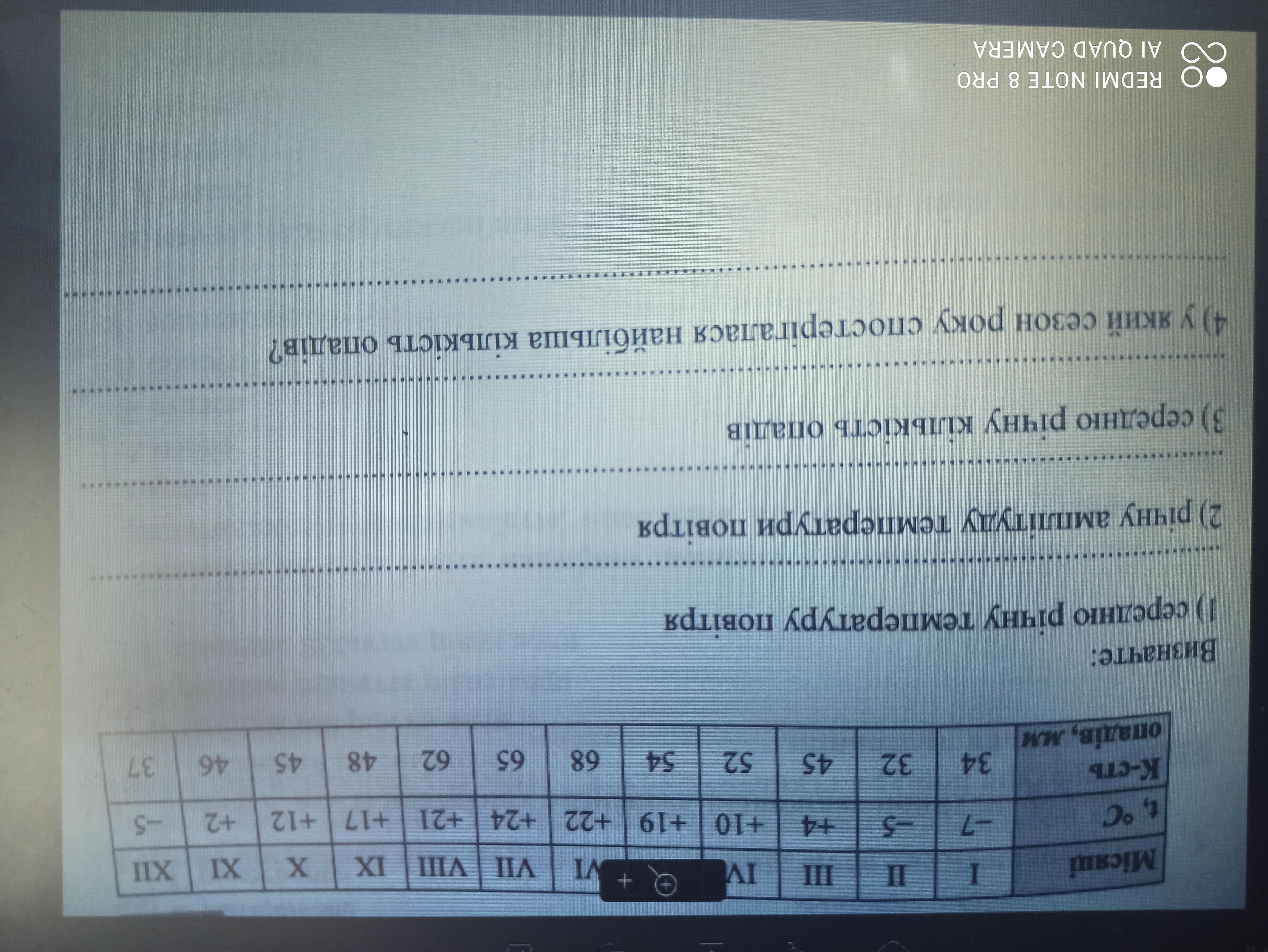 1. Середня річна температура повітря -7-5+4+10+19+22+24+21+17+12+2-5/12=9,5 градусів Цельсія. 2.Річна амплітуда температури повітря—різниця між найвищою та найвищою температурами. 24-(-7)=31 градус Цельсія. 3. Середня річна кількість опадів=34+32+45+52+54+68+65+62+48+45+46+37/12=49( мм) 4.За весну випало—111( мм). За літо—174( мм). За осінь—175( мм). За зиму—128( мм). Отже, осінью спостерігалася найбільша кількість опадів.