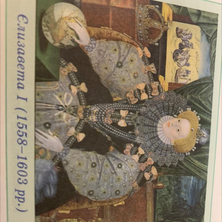 Портрет Єлизавети на честь перемоги над Армадою (1588), де її зображено на тлі битви. Рука королеви спочиває на глобусі, символізуючи її міжнародну силу...